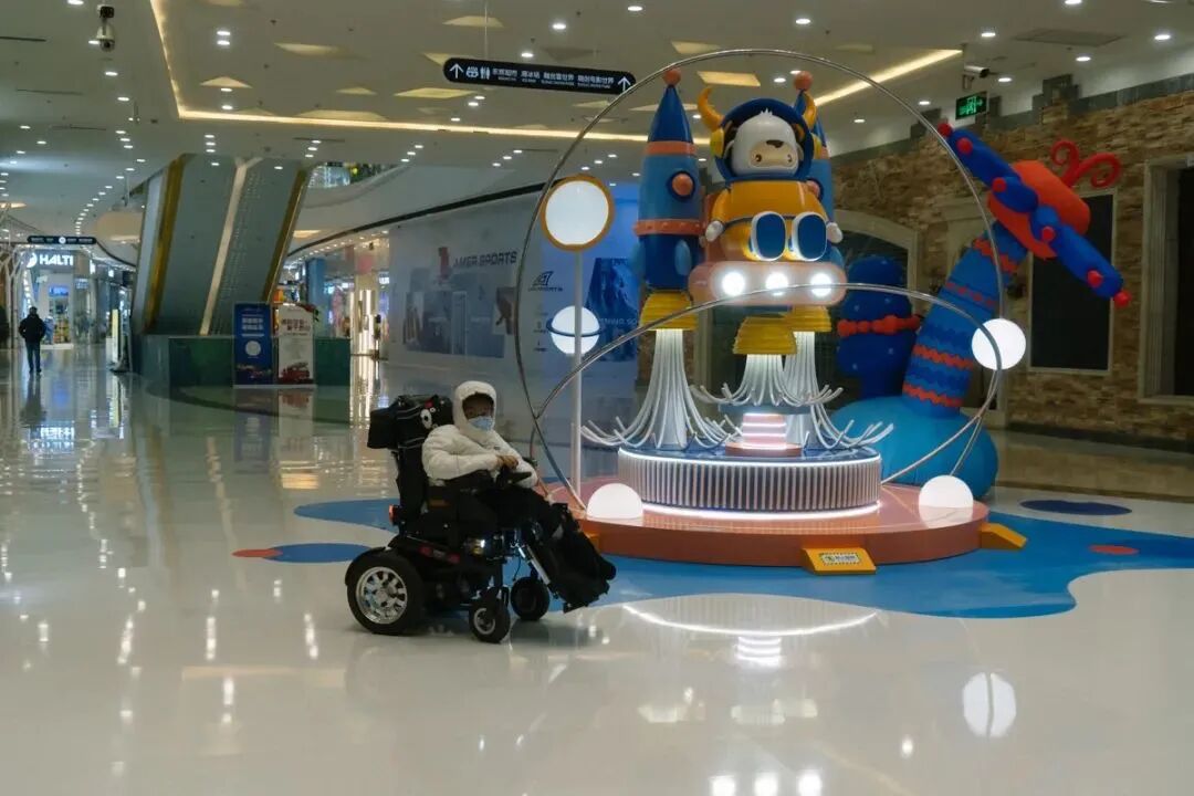我见到他的第三天,摄影师、我跟罗罔极母子俩一起出门,去他常去的万达影院拍照。妈妈先帮套上羽绒服,戴好帽子,身体调整到舒服的坐姿。然后,她把他的左手放到轮椅的操纵杆上,右手叠放到左手上。他得用两只手推控操纵杆。