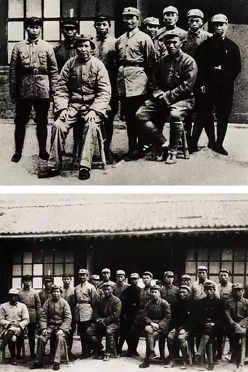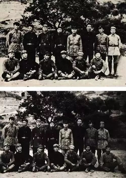 1937年,中央苏区的战友一起在红军大学里与毛泽东、朱德合影。迟至1986年,国内公开出版物上仍使用的是修改过的照片(上图)。下图前排左起:聂鹤亭、毛泽东、朱德、林彪、何长工、周子昆、赖毅;后排左起:杨得志、梁军、杨梅生、陈赓、贺子珍、姚喆、胡荣奎、萧新槐、江华、谭家述、谭冠三、刘型、张际春
