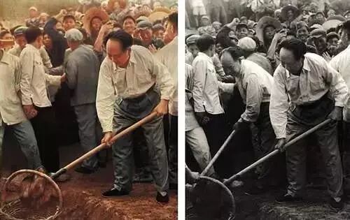 毛泽东在时任北京市长彭真的陪同下到北京十三陵水库参加义务劳动。文革中,彭真被打倒,左图为官方宣传照,彭真早已无影无踪了。右图为原照片,毛泽东左边的为彭真