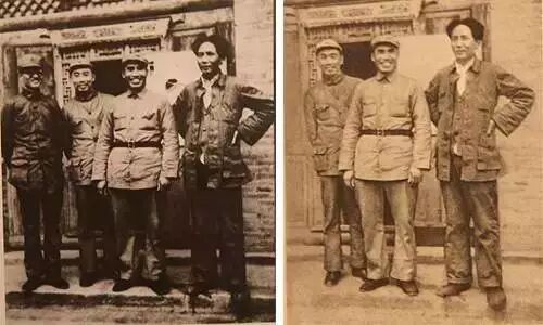 1940年,周恩来从共产国际归来,与任弼时、毛泽东合影。左图修掉了任弼时,原因是战争时期任弼时在苏联养病,没有在困难时期参与到战争中,遭到了批判