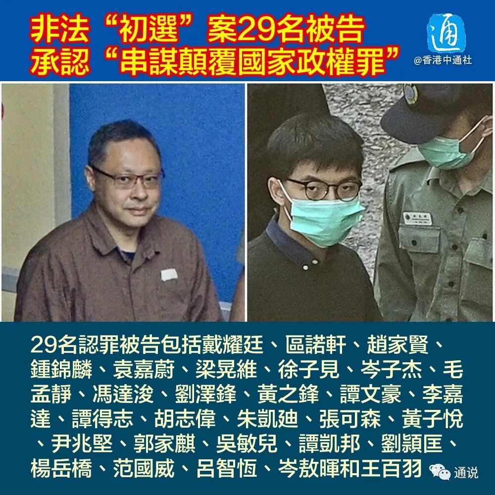 8月18日,香港非法“初选”活动涉嫌违反香港国安法一案在香港聆讯。核心人物戴耀廷、黄之锋等29名被告承认控罪。