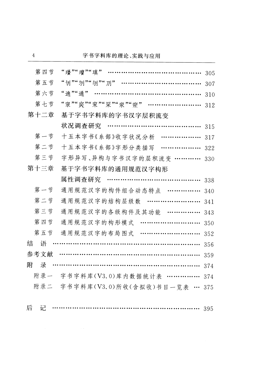 感谢我指导的硕士研究生:史晓丹、安冬雪、王伊佳、单志鹏、邢蕴荠、李超、徐丽雪、王海孟、李美璇、程银燕、马健、王健洁、姜泽兵、董倩、韩鼎新、曲波、张梦、郑琼、秦冕、冯宝成、王修竹。他们在字料库建设(尤其是字料数据的录入与标注)方面给予我重要支持。他们基于字料库的字书汉字研究成果对于字料库汉字学理论的发展颇有助益。现在他们或在读书,或已工作,希望他们未来的路能越走越宽!