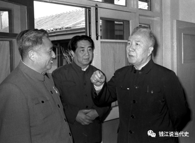 晚年周扬(右1)和人民日报总编辑秦川(中)、文艺部主任袁鹰(田钟洛,左1)谈文艺问题。