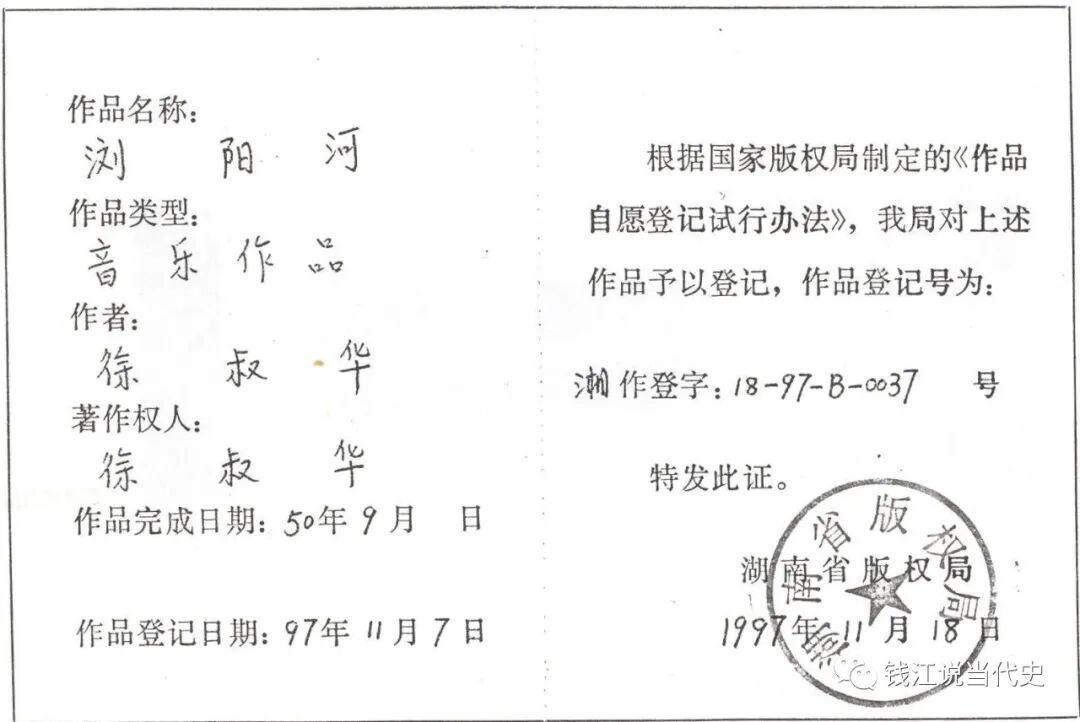 以本文作者对著作权法的研究,根据徐叔华保存的创作原稿,可以判断他本人就是新扩展歌词的作者。而在“文革”中曾奉命修改《浏阳河》的两人没有提供可信材料,来证明他们当时究竟写下了什么?