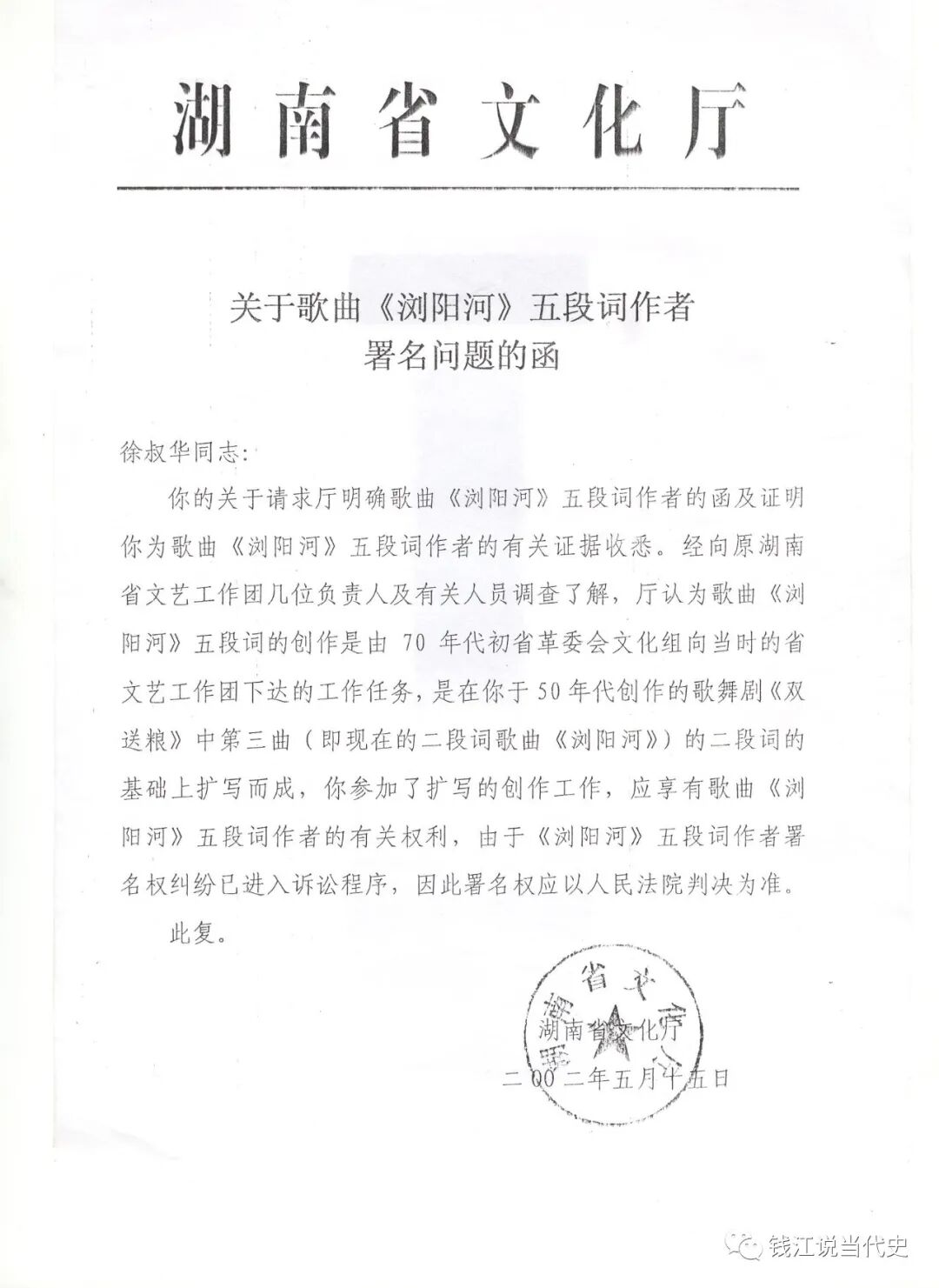 湖南省文化厅2002年5月致徐叔华的函件,其中说明,徐叔华“应享有歌曲《浏阳河》五段词作者的有关权利”。