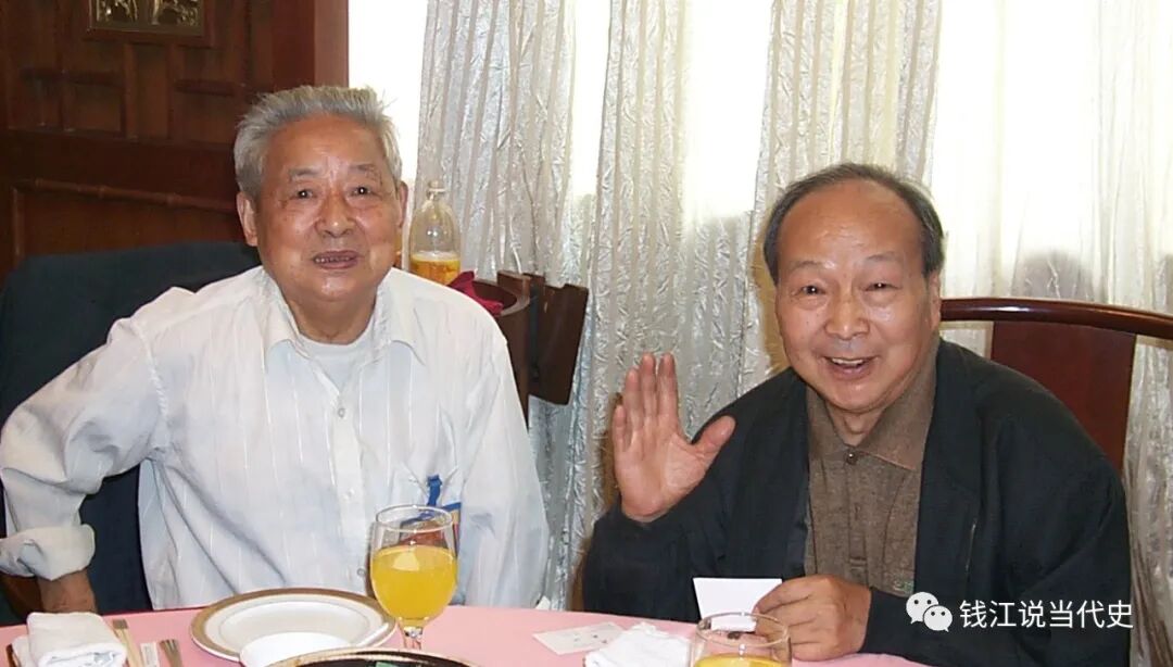 传唱歌曲《浏阳河》的曲作者唐璧光(左)和词作者徐叔华(右)。 本文作者摄于2003年秋