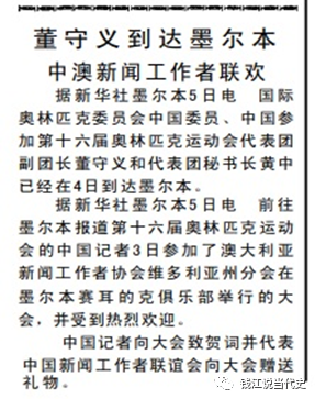 1956年11月6日的《人民日报》刊登了董守义、黄中抵达墨尔本的消息。