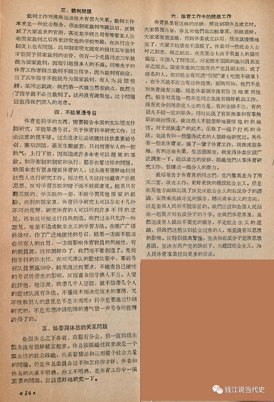 然而,这篇稿件在董守义离京后刊登在1957年7月6日出版的第13期《新体育》杂志上,题目是《体育工作中的几个问题》。主要谈6个方面的意见,分6个小标题:一,体委应该主要抓什么?二,关于”轻视体育和体育工作者”的问题;三,裁判问题;四,不能单凭号召;五,体委与体总的关系问题;六,体育工作中的统战工作。近3000字。