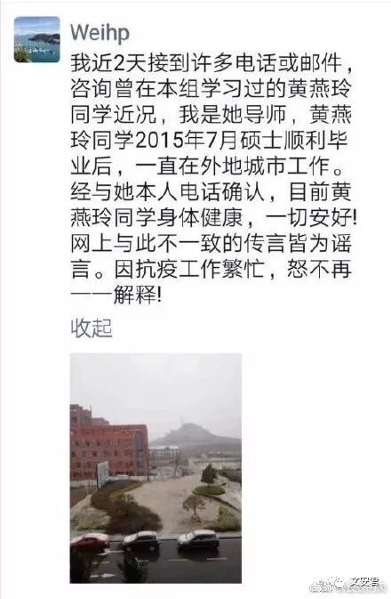 黄燕玲的指导老师危宏平,朋友圈发文回应:“我近2天接到许多电话或邮件,咨询曾在本组学习过的黄燕玲同学近况,我是她导师,黄燕玲同学2015年7月硕士顺利毕业后,一直在外地城市工作。经与她本人电话确认,目前黄燕玲同学身体健康,一切安好!”
