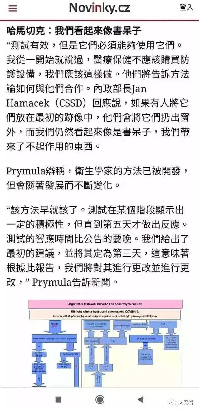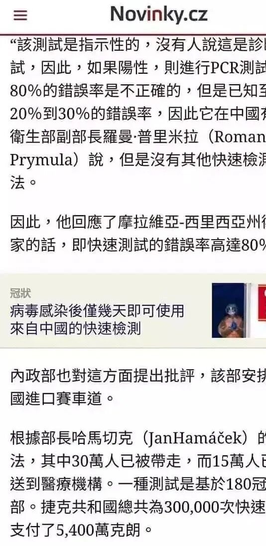 捷克媒体原文,虽然为了吸引眼球,使用了“来自中国的冠状病毒快速检测试剂盒错误率高达80%”这样一个标题,但是新闻中还是引述了捷克副总理兼内政部长简·哈马切克的解释。