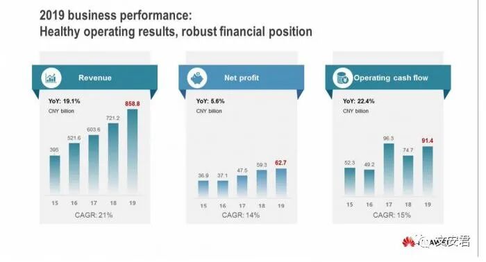 华为2019年年报,销售收入8588亿元人民币,同比增19.1%,净利润627亿元增5.6%。