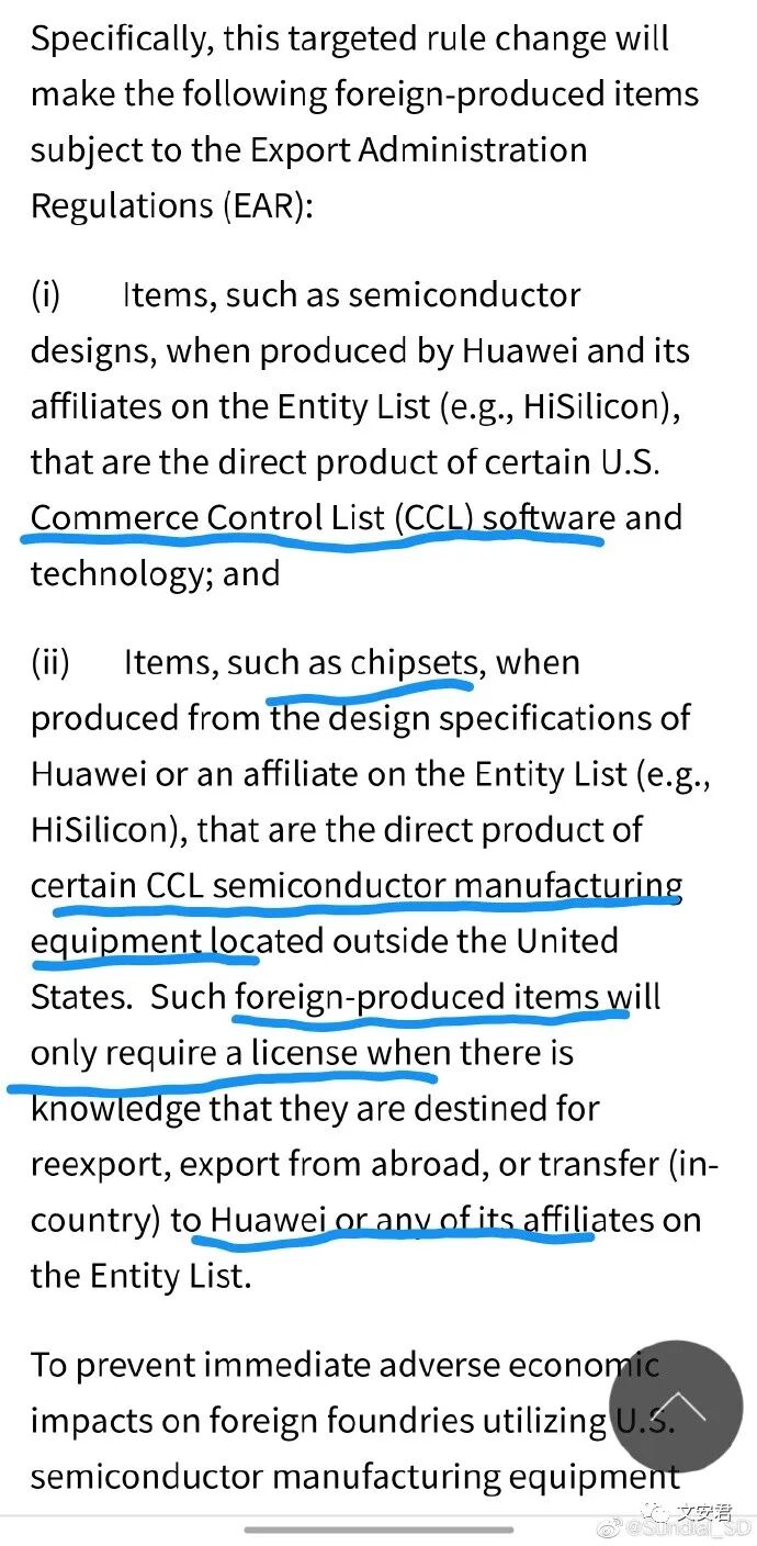 第二,对于位处美国以外,但被列为美国商务管制清单中的生产设备,要为华为和海思生产代工前,都需要获得美国政府的许可证,这包含出口、再出口,跟转运给华为和海思(美国境内的设备在2019年就已被限制)。