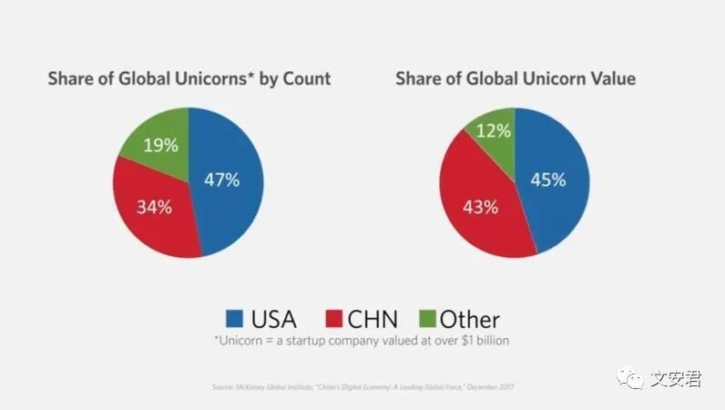 左图是全球独角兽企业的数量比例:中国34%,美国47%,全世界其它国家19%;