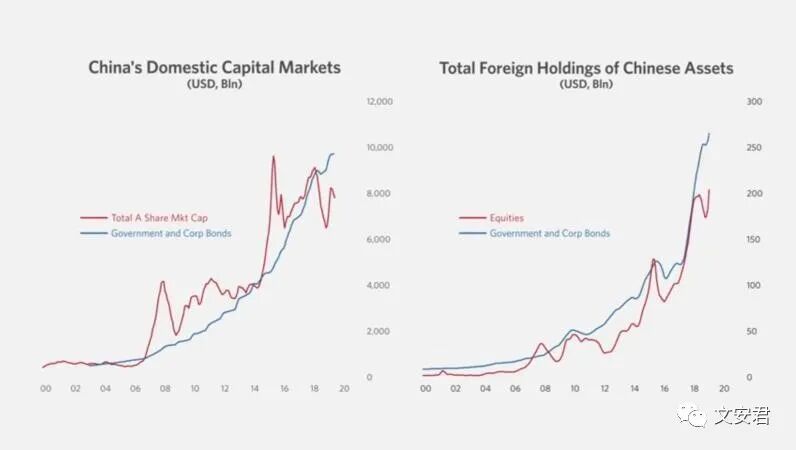三、左边是中国资本市场的增长,右边是国外资本持有的中国资产。资本是最诚实的,不管媒体怎么宣传,右图清楚了表明了外国资本的态度——用桥水基金CEO的话说,现在如果你不看多中国,你就是个傻子(不是原话,大意)