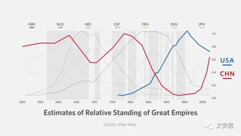 一、三个前世界霸主——荷兰、英国、美国,与中国从科技教育、产出、贸易、军事、金融以及储备货币6个方面的全面比较。(灰色块是战争时期)。