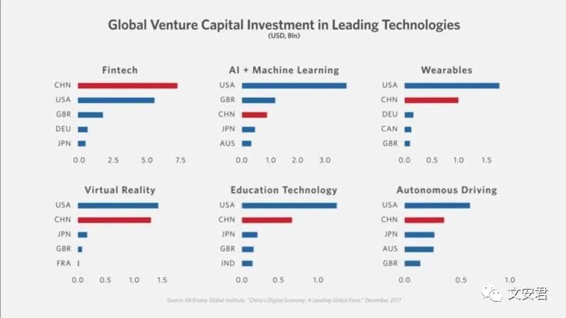 四、对领先科技领域的风险投资,分别是金融科技、人工智能、可穿戴设备、虚拟现实、教育科技和自动驾驶。这种投资代表了一个国家在高科技领域的市场潜力和发展潜力。