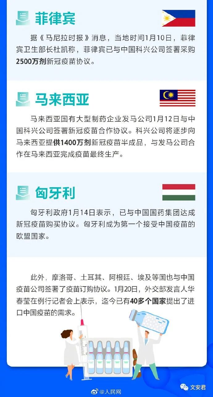 很多国家总统、国王还特地在镜头前公开施打。智利总统更亲自到机场迎接大陆疫苗专机,他满脸兴奋像是中了乐透。中国大陆新冠疫苗采用非常成熟的灭活技术,副作用小。贮存环境要求低,适合运输。价格便宜,中国拥有强大的生产能力。大陆本土疫苗在本土已经接种了2000多万。没有严重不良反应和事故。随着中国新冠疫苗在国内外推广使用,其安全性和有效性日益得到多国认可,越来越多国家将目光投向中国。以前说“不买中国疫苗”的巴西总统也改口了,相信未来的一年,会有更多国家采用中国疫苗,对中国表示感谢。