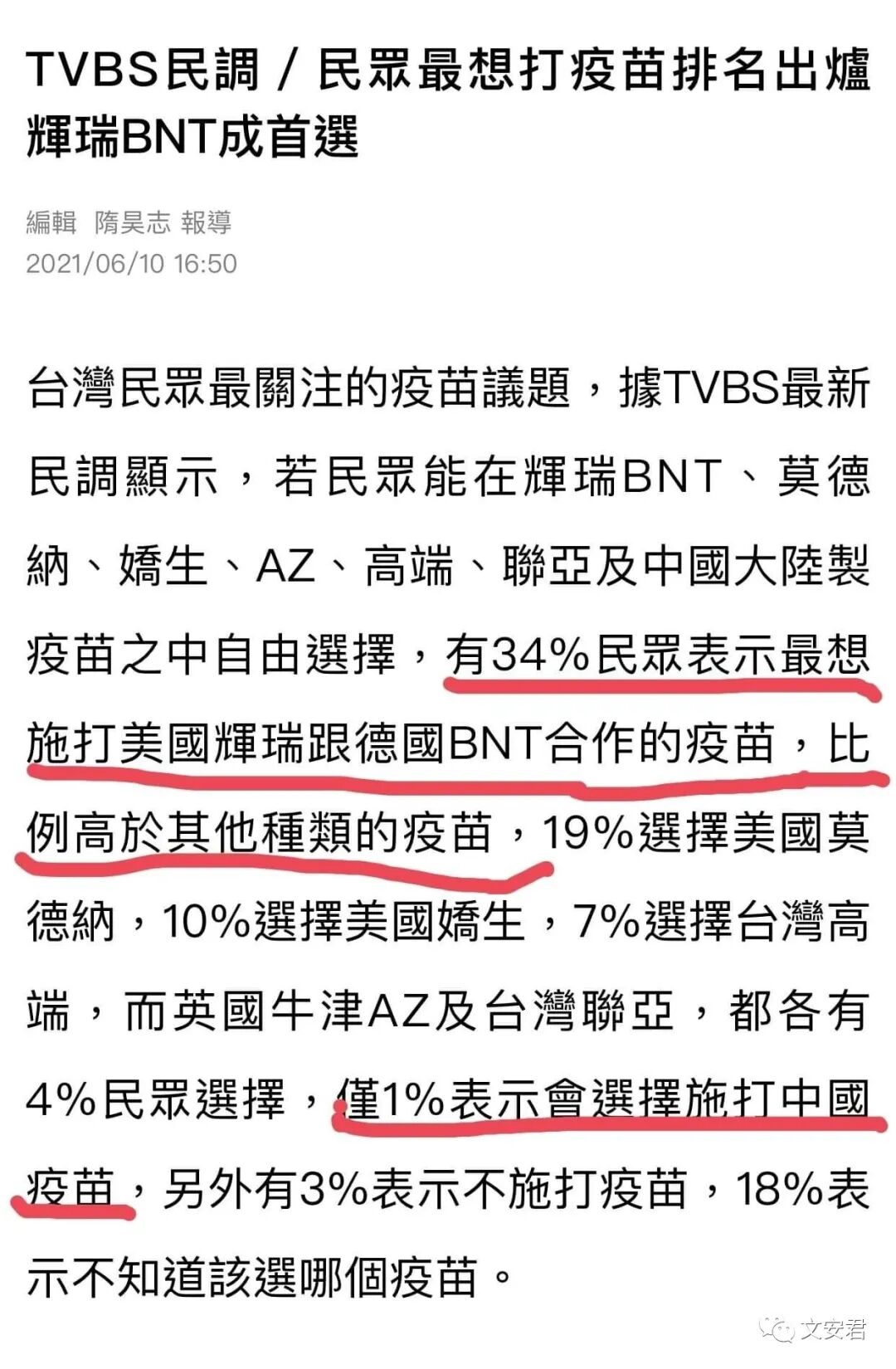 台湾TVBS民调,台湾有34%民众表示最想施BNT疫苗,7%选择台湾产高端疫苗。