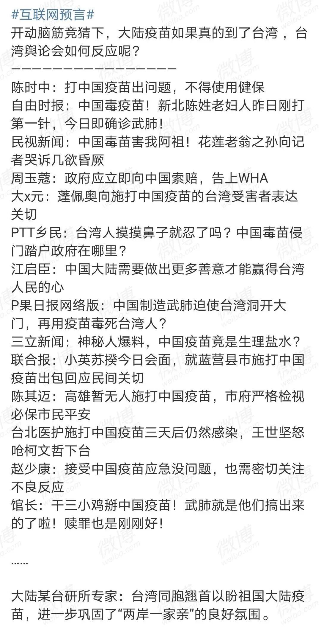 大嘴发言人:疫苗到了台湾,会发生什么?将来他们爱情不顺、事业失败、考试失利,全都得赖到大陆疫苗身上,都是大陆疫苗害的