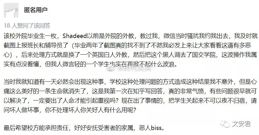 事后曾挽留Shadeed留校的刘lily老师,还把宁波一网警写的那篇“中国人该平视”文章发到校友群,把感情纠纷作为重点推送。