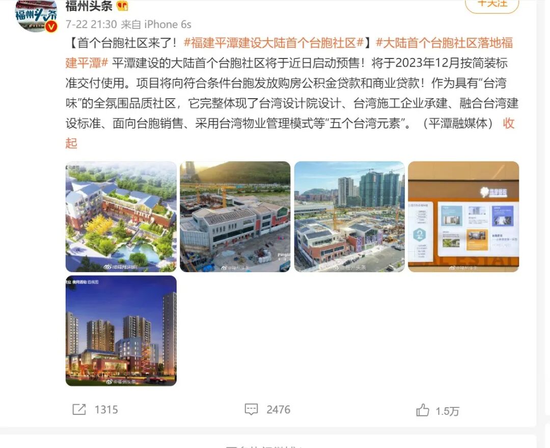 1. 看到 #福建平潭建设大陆首个台胞社区# 的新闻。