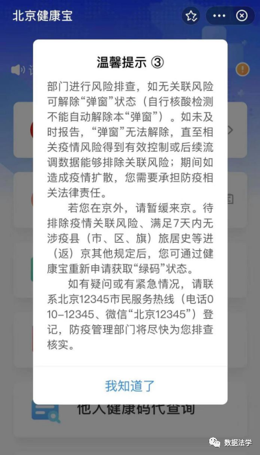 自今年9月起,顾某一直受到健康宝弹窗的困扰:他的健康宝一直显示“温馨提示③”弹窗状态,他因此无法前往北京。在一个多月的时间里,顾某多次尝试通过北京12345等途径寻求申诉解决;申诉解决无果后,他最终选择了司法救济,试图通过行政诉讼讨个说法。