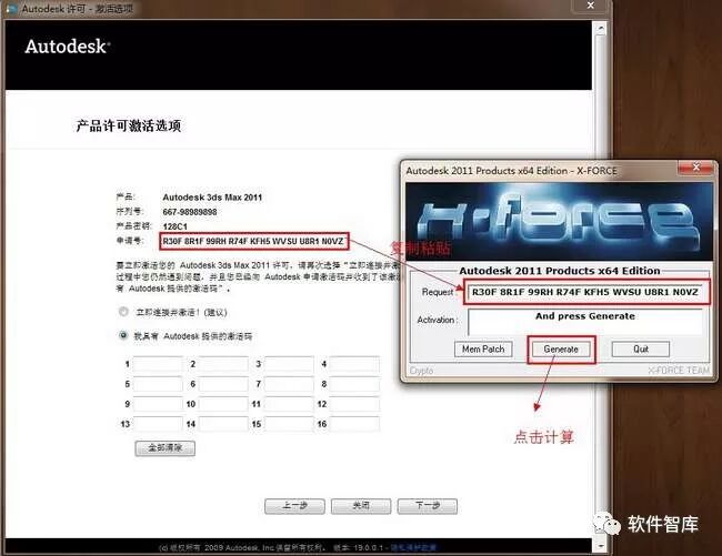 23.将安装界面中的申请号复制粘贴到注册机里Reequst栏中,特别要注意的是看看申请号的后四位数字有没有复制全,确认无误后,点击【Generate】成激活码,注意:复制粘贴只能用用快捷键Crtl+C、Crtl+V
