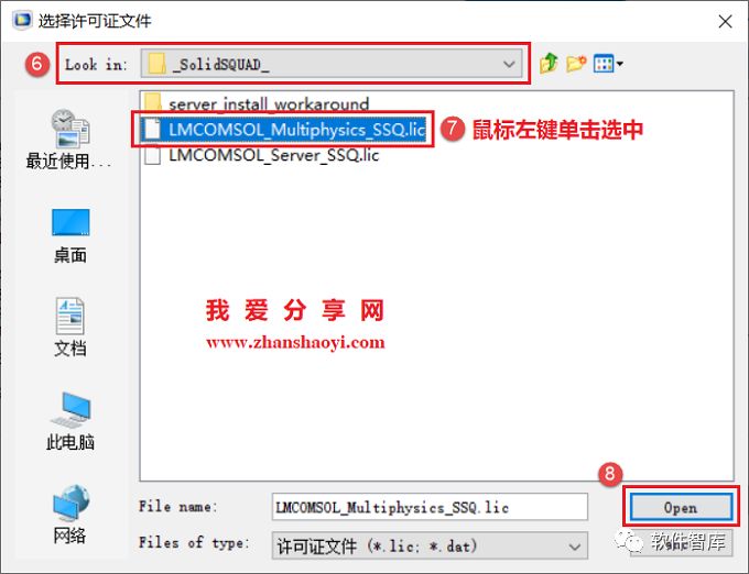 6.打开“选择许可证文件”窗口,先将Lookin修改为初始软件安装包中_SolidSQUAD_文件夹,然后单击“LMCOMSOL_Multiphysics_SSQ.lic”文件,点击【Open】按钮