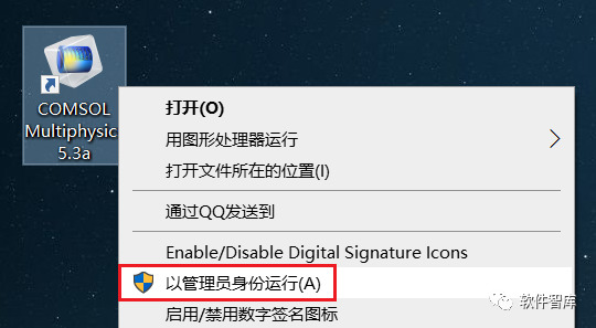 14.返回电脑桌面,找到COMSOL53a图标,鼠标右击选择【以管理员身份运行】