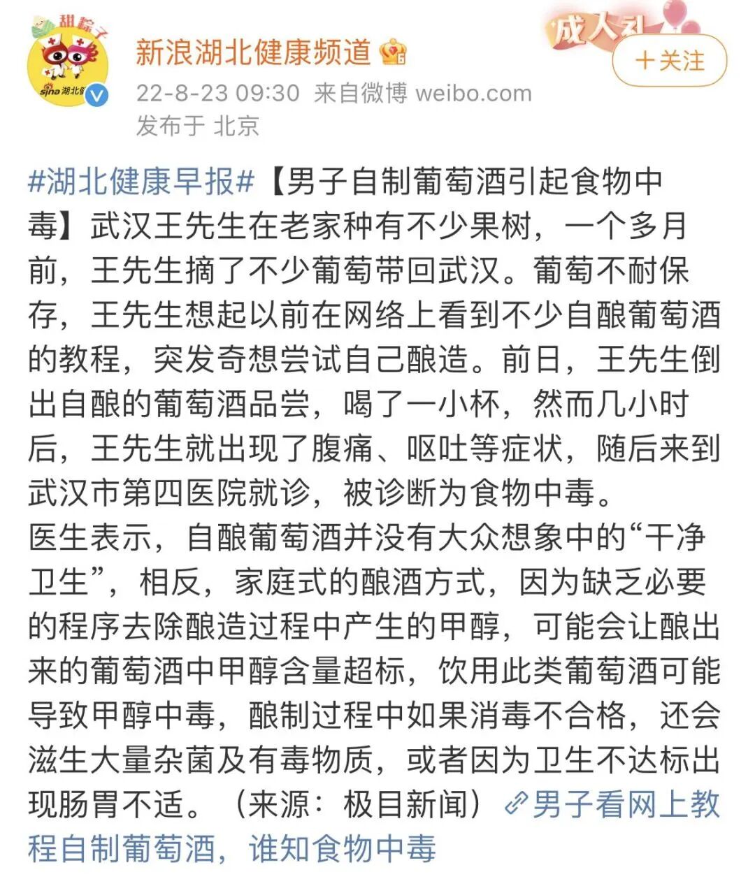 在家自酿葡萄酒,既没有严格按照标准的步骤酿制,也不具备专业的发酵环境和消毒条件,可能就会隐藏着甲醇、杂醇油等有毒有害物质,存在某些有效成分含量低、微生物超标等情况。