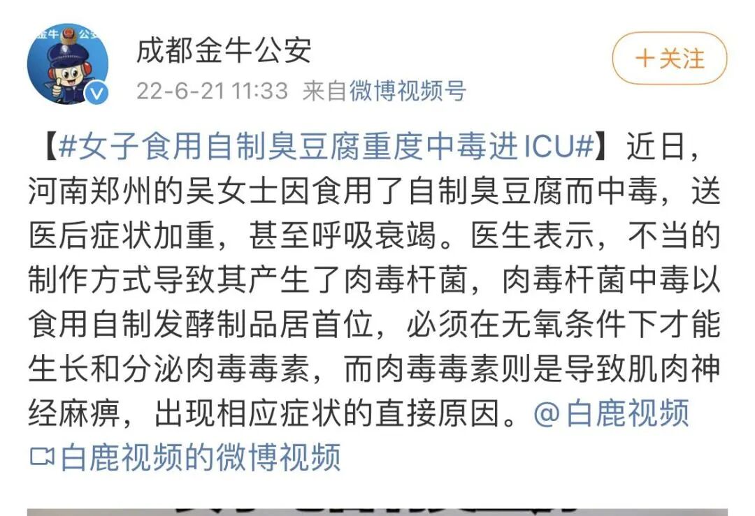 自制豆制品时,如果杀菌不彻底,会使一些污染细菌在此过程中以成倍的速度迅速繁殖。如果污染的细菌是肉毒杆菌,就可能引起肉毒杆菌中毒。