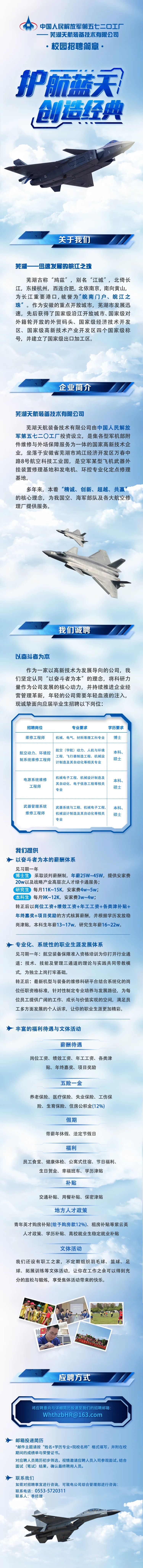 工厂秉持“以军为本,多业并举”发展理念,致力于打造国内领先的专业化、专家型的高科技航空装备保障企业。真诚欢迎有志于为航空装备发展事业做贡献的优秀学子来厂创新创造、共图大志、谱写辉煌!