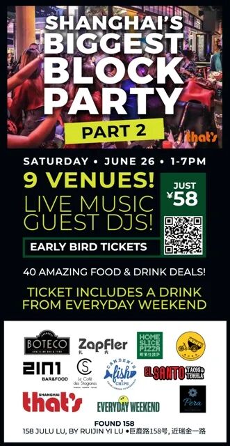 Yup, that's a whole lotta good times, and all for just RMB58. But remember, you'll need the wristband to join in the fun, and early bird tickets are limited – get yours now by scanning the QR code on the poster:Found 158 Sat June 26, 1-7pm. Found 158, 158 Julu Lu, by Ruijin Yi Lu 巨鹿路158号, 近瑞金一路.
