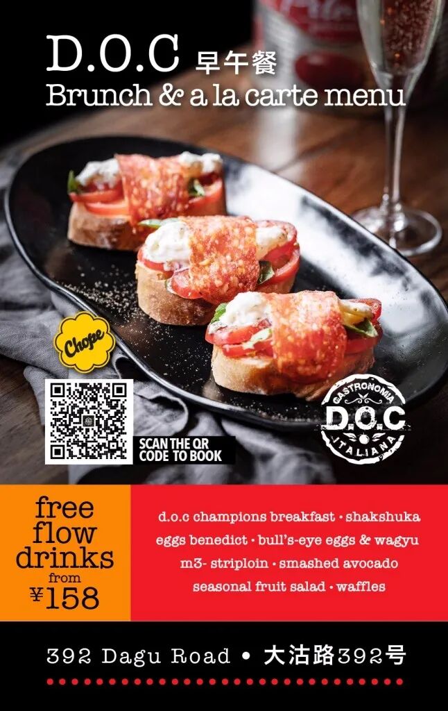 Every weekend sees a feast of options at D.O.C. including its famous Champions Breakfast, Bull's-Eye Eggs with Wagyu M3 Striploin and the classic Smashed Avocado, as well as the option of free flow drinks from just RMB158.