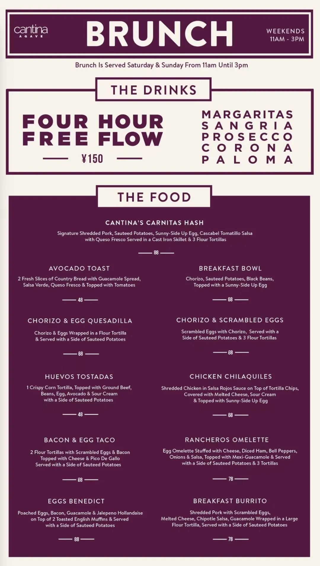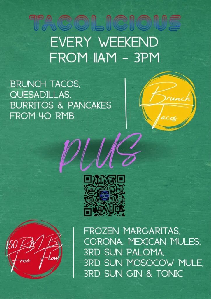 Brunch Tacos, Quesadillas and Burritos go from RMB40, while free flow Beer, Mexican Mule and Frozen Margarita will set you back just RMB150 from 12-3pm every weekend at Tacolicious.