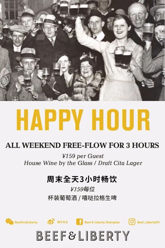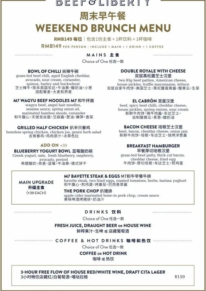 Every Saturday and Sunday, Beef & Liberty Shanghai Centre offers an all-day weekend brunch set at RMB149, which includes selected burgers and main courses such as Wagyu Noodles, Canadian Pork Chop and Grilled Spring Chicken and includes a Juice, Wine or Beer and a Coffee.