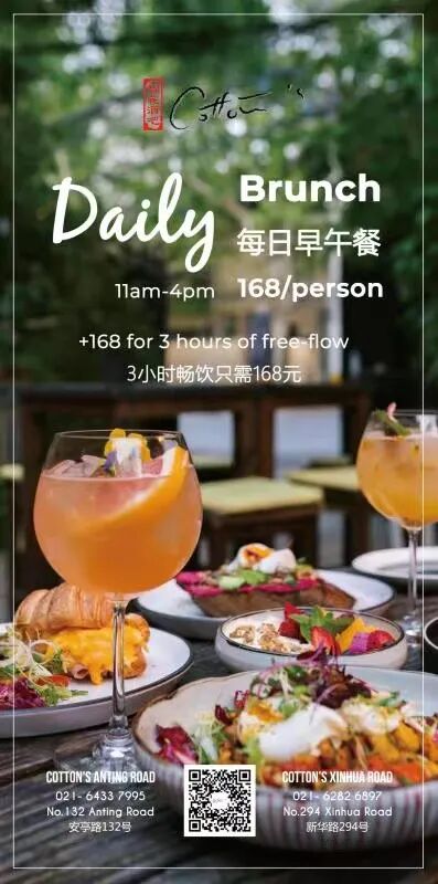 Enjoy brunch in the Cotton's gardens and cool off with three hours Beer free flow for RMB168, or go classy with Wine, Aperol or Sparkling for RMB268.
