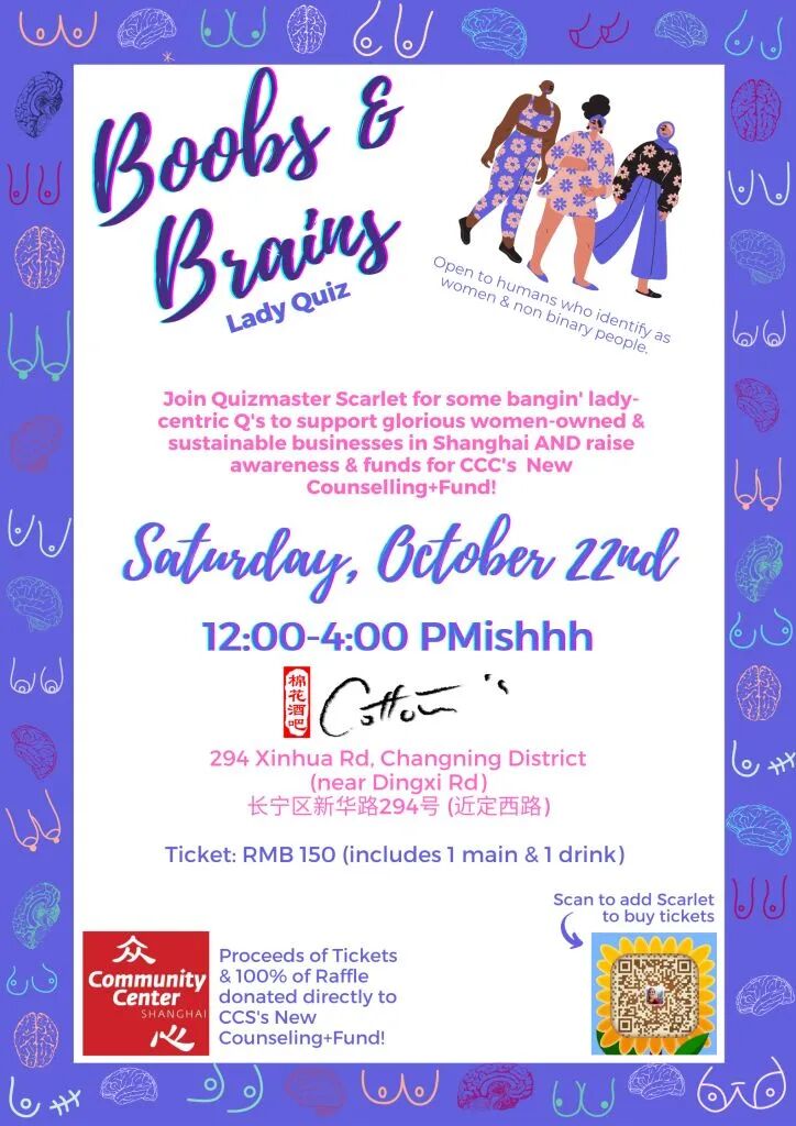 Catrina is one of the most iconic characters in Mexican culture. In this three-hour workshop you will have the opportunity to learn the story behind them, at the same time as transforming your old Barbie into one! Have fun designing and styling their outfit ,hair and makeup, and then display it in an exhibition at 889 Plaza on October 29.There will be snacks, you just need to bring your doll, her shoes and a bottle of water with your name on it. Suitable for ages 6 to 12 years.Sat Oct 22, 9am-12 Midday, 1-4pm; RMB400.889 Plaza 889 Wanhangdu Lu, by Changshou Lu 万航渡路889号, 近长寿鲁.Boobs & Brains Lady Quiz @ Cotton's