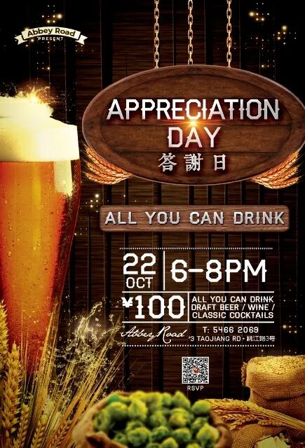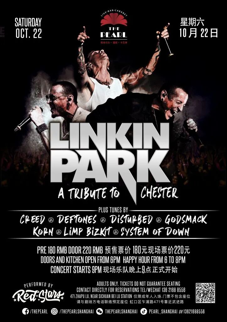 It's Appreciation Day at Abbey Road this Saturday, which means free flow drinks from 6-8pm for just RMB100. We appreciate you too Abbey Road!Abbey Road3 Taojiang Lu, by Fenyang Lu 桃江路3号, 近汾阳路.Linkin Park: A Tribute to Chester @ The Pearl