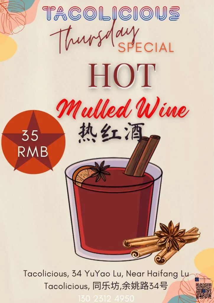 To welcome in the winter months, hot mulled win is just RMB35 at Tacolicious each Thursday.TacoliciousRoom 104-105, 34 Yuyao Lu, by Xikang Lu 余姚路34号1幢104-105室, 近西康路.Friday
