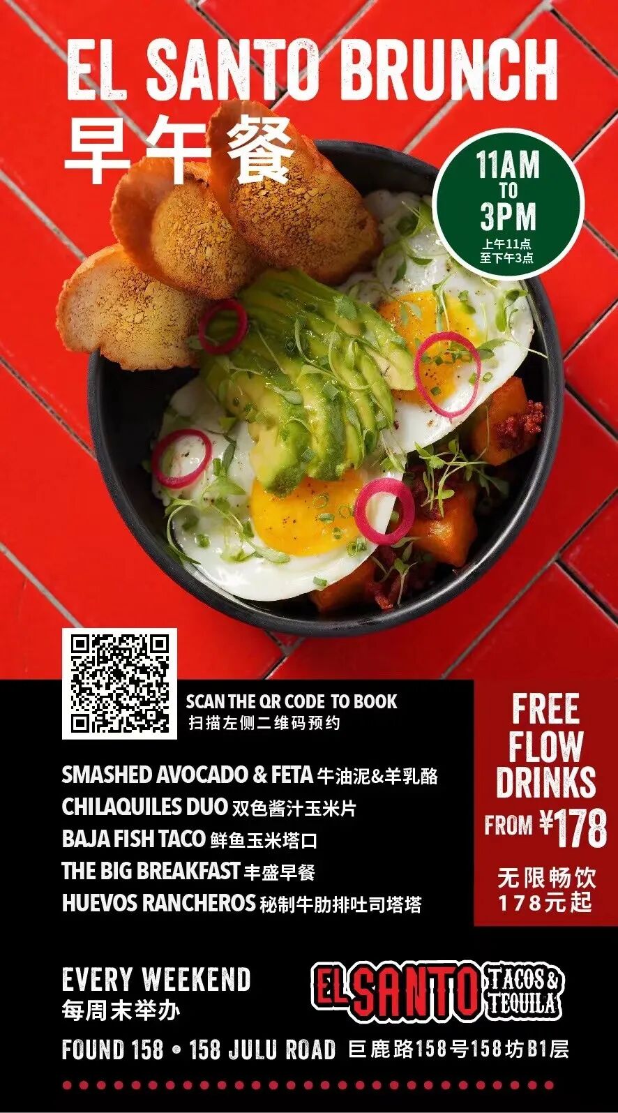 El Santo kicks off brunch every weekend from 11am-3pm with classics and signature dishes including Smashed Avocado & Feta, Short Ribs & Eggs Benedict Burrito, Huevos Rancheros and more.