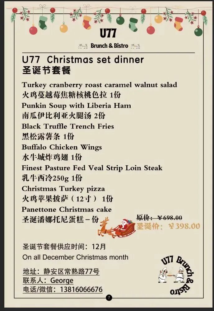 Nothing screams Christmas more than bulky knitwear, pun-heavy Santa phrases and clashing vivid-colored prints, and Tacolicious is inviting all that and more with an ugly sweater competition in Christmas Eve to honor the great Saint Nick.Dance off that extra scoop of Christmas pudding with a DJ starting at 8pm.Then, swing through again the next day for their Christmas menu, with vegetarian and pescatarian options available as well for those booking 48 hours in advance. See the menu on the flyer above, and make a reservation to secure your spot.Oh, and festive drink specials run every day, all month at Tacolicious for just RMB50. Expect spiked peppermint hot cocoa, hot apple cider with a whiskey kick and creamy chai hit with bourbon.When? Ugly Sweater Party Dec 24 from 8pm, Christmas Dinner Dec 25How much? Free entry for Ugly Sweater Party, RMB298 per person or RMB550 for two persons for Christmas DinnerTacoliciousRoom 104-105, 34 Yuyao Lu, by Xikang Lu 余姚路34号1幢104-105室, 近西康路.U77 Brunch & Bistro