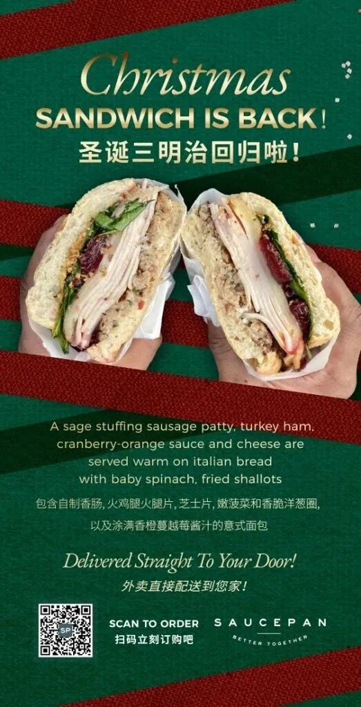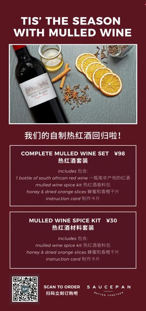 Saucepan is offering up two delivery specials this holiday season: their famous Christmas sandwich by Homeslice's very own Nat Alexander...... and mulled wine sets.Order via the flyer's QR code.What? Christmas Sandwich and Mulled Wine SetHow much? Mulled Wine Set RMB98, Mulled Wine Spice Kit RMB30St. Regis