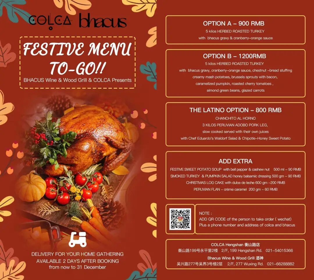 Colca and Bhacus are both offering festive set menus to-go. Choose from Herbed Roasted Turkey or Chanchito Al Horno and pick your add-on options of sides.Make sure to book at least two days in advance.What? Check out the options aboveHow much? Mains: RMB800-1200; Add-ons: RMB60-200ColcaRoom 2201, 2/F, 199 Hengshan Lu, by Yongjia Lu 衡山路199号2楼2201, 近永嘉路.bhacus2/F, 277 Wuxing Road 吴兴路277号,2楼.Fairmont Peace Hotel