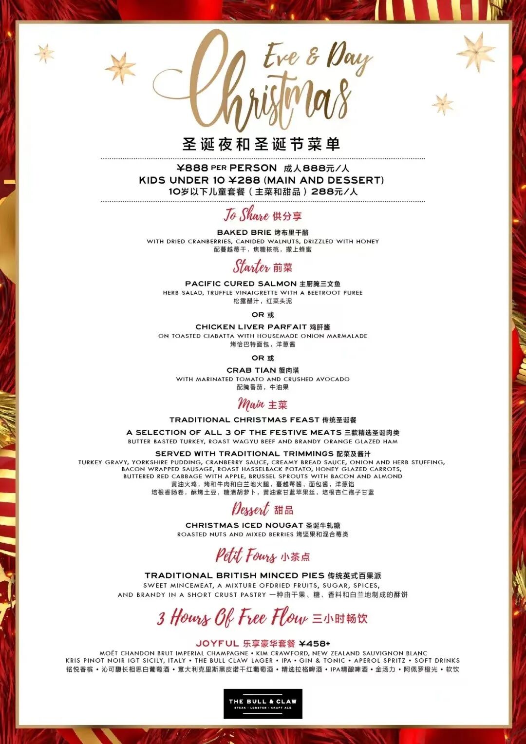 Ring in this holiday season in style at The Bull & Claw with festive favorites, like a trio of meats (Butter Basted Turkey Breast, Roast Wagyu Beef, and Brandy Orange Glazed Ham) with all the trimmings.Savor a Christmas Iced Nougat for dessert, plus petit fours. And don't forget to add on 3-hours of free flow. The Bull & Claw is also offering holiday private event bookings (by reservation) with traditional 3-course Christmas menus starting from RMB288 per person. How much? RMB888 per person, RMB458+ for 3-hours of free flow, RMB288 for kids under 10Colca