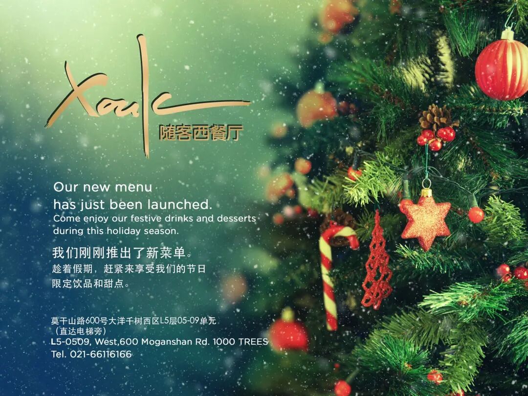 Savor in Xouk's new Christmas-themed menu, with festive drinks and desserts this holiday season.XoukL5-0509, West 600 Moganshan Lu (1000 Trees) 天山路600号大洋千树西区L5层0509.Christmas Meals To-Go