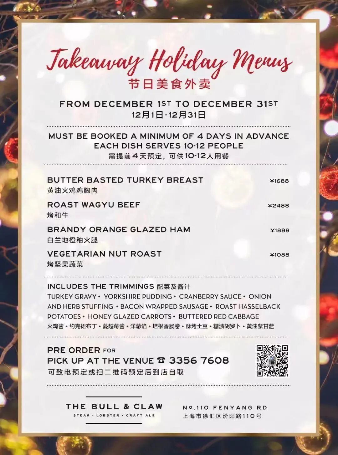 Book your takeaway Christmas meal four days in advance through The Bull & Claw, and host your Christmas celebrations at home with friends and family.Choose from Butter Basted Turkey Breast, Roast Wagyu Beef, Brandy Orange Glazed Ham or Vegetarian Nut Roast (or order a mix of any or all four), and receive all the holiday trimmings.How much? See pricing on flyer based on main dish selectionCages Jing'an