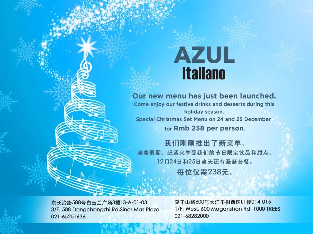 Enjoy Italian-inspired festive drinks and desserts during this holiday season at Azul Italiano with their special Christmas set menu. How much? RMB238 per personAzul Italiano (1000 Trees) L1F-14, 600 Moganshan Lu, by Changhua Lu 莫干山路600号,L1F-14,近昌化路.