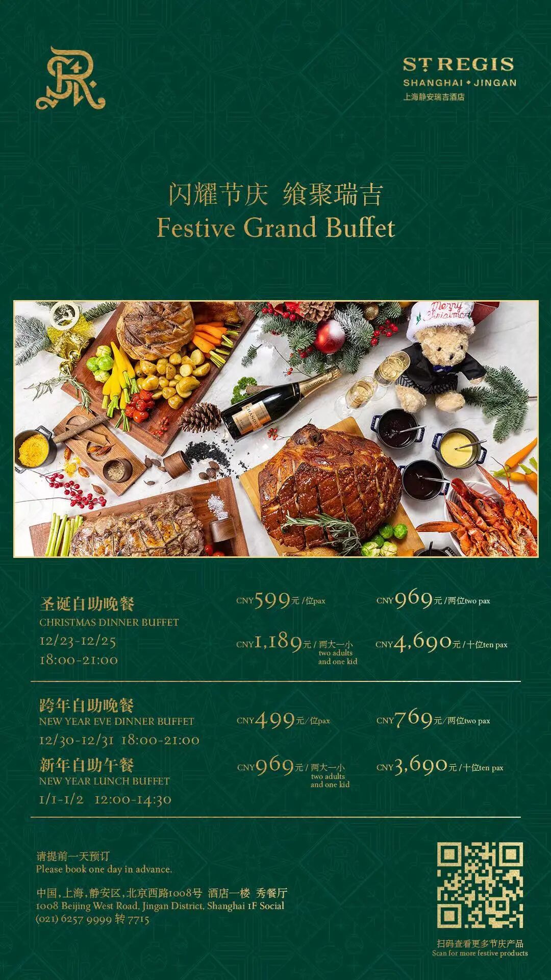 When? Now-Dec 31 at Cafe Central, Dec 24 at Al Capello TrattoriaHow Much? Christmas Season Dinner Buffet for RMB388 per person (RMB194 for kids 6-12 years old) at Cafe Central. On Dec 24, Christmas Eve Set Menu for RMB888 per couple at Al Capello Trattoria or Christmas Eve Dinner Buffet for RMB588 per person (RMB298 for kids 6-12 years old or RMB1,188 for a family set) at Al Capello Trattoria.Social at The St. Regis Shanghai Jingan