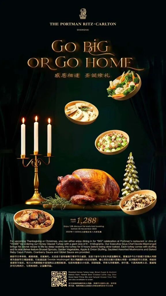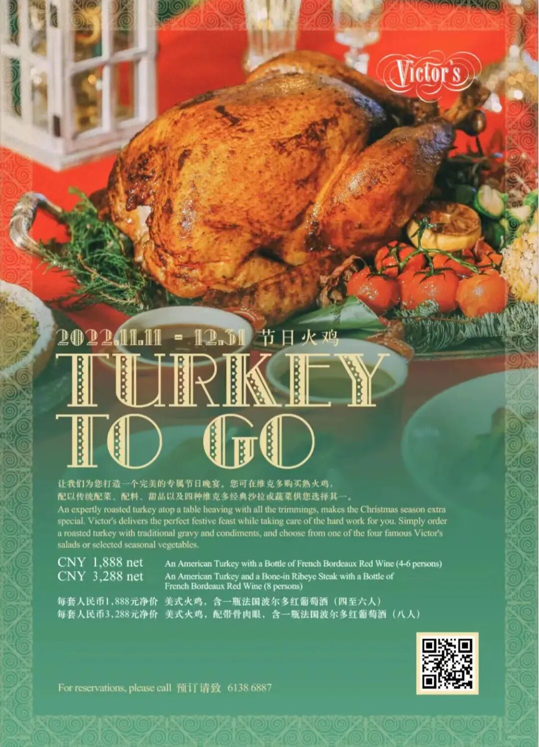 An expertly roasted turkey atop a table heaving with all the trimmings, makes the Christmas season extra special.What? Victor's delivers the perfect festive feast while taking care of the hard work for you. Simply order a roasted turkey with traditional gravy and condiments. And choose from one of the four famous Victor's salads or selected seasonal vegetables.When? From now until Dec 31How much? An American Turkey (4-6 persons) with a Bottle of French Bordeaux Red Wine RMB1,888 net; An American Turkey (8 persons) and a Bone-in Ribeye Steak with a Bottle of French Bordeaux Red Wine RMB3,288 net. For reservations and queries, please dial: 6138 6887.And the deal? Scan the QR code and order from the wechat mall with more favorable price*48-hour advance booking is requiredJing An Shangri-La, Shanghai
